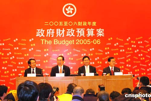 香港财政司司长唐英年16日在香港公布了香港05-06年度财政预算报告﹐在傍晚时分与其它官员一起出席在政府合署举行的记者会。作者:赵振清