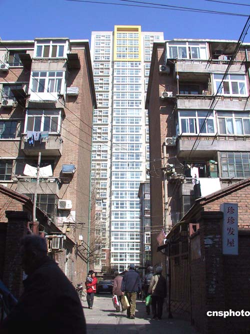 三月十八日,位于北京朝阳区双井附近的和平村,其破旧、丑陋的红砖平房与身后的旧居民楼和新建的商品楼形成强烈反差。和平村是北京市目前面积最大的“城中村”,当局正为改变和平村现状进行拆迁改造。由于北京市房价高昂,对于部分拆迁户,当地政府已与房地产公司达成协议,将向他们提供部分价格相对低廉的经济适用房。作者:纳梦月