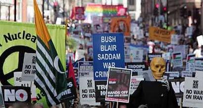 反战人士以“让我们的军队回家”为口号,抗议布莱尔政府两年前派军队入侵伊拉克,并要求英国军队立即从伊拉克撤军。伦敦市长利文斯通和曾被美国政府关押在美军关塔那摩基地的英国人穆班加向示威民众发表了演讲。示威者还前往美国大使馆前抗议。