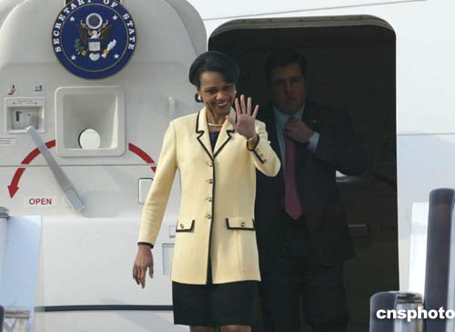 三月二十日下午,美国国务卿赖斯抵达北京机场。作者:廖文静
