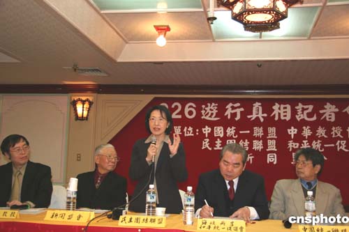 中新社台北三月二十日电(记者 赵江涛 董会峰)中国统一联盟、中华教授协会、民主团结联盟、和平统一促进会、新同盟会今天在此间举行“三二六游行真相联合记者会”。与会人士指出,以所谓“反‘反分裂法’”、“反并吞”为由发动“三二六”游行,因果倒置、不负责任,对台湾民众没好处,也无益于两岸关系改善。
