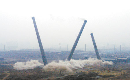 占地36万平方米的沈阳冶炼厂始建于1936年,它的黄金、白银产量一度居中国前列,铜、铅、锌等产品也占有举足轻重的地位,但这却是以牺牲城市生态环境为代价换取的。2000年,国家决定对其关闭破产。2004年3月23日6点,沈阳炮院爆破技术研究所采用专业的定向爆破技术将冶炼厂的3根百米烟囱成功爆破。在同一场地、同时起爆三根百米烟囱在亚洲是第一次,在国际上也属罕见,为此原沈阳冶炼厂3根百米烟囱的爆破成为了“亚洲第一爆”。