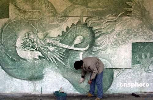 日本爱知世博会开幕在即,中国馆已经整备完毕静候开展。图为有关工作人员精心擦拭九龙纹外墙。作者:王健