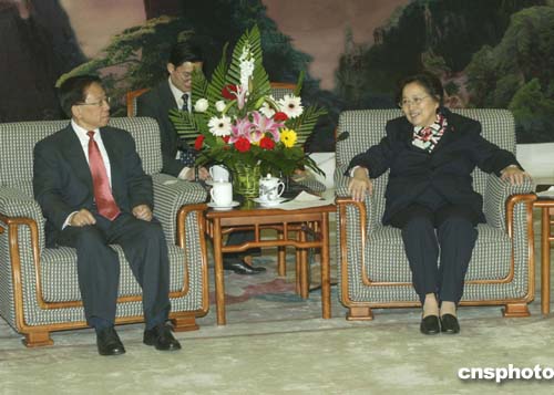 三月二十二日,全国人大常委会副委员长何鲁丽在北京人民大会堂会见吴显扬、关其炼团长率领的芝加哥中华会馆访华团。作者:史利