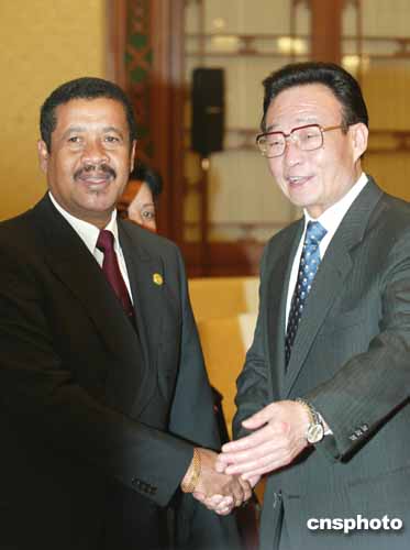 全国人大常委会委员长吴邦国三月二十三日在北京会见来访的马达加斯加国民议会议长拉依尼里库一行。作者:满会乔