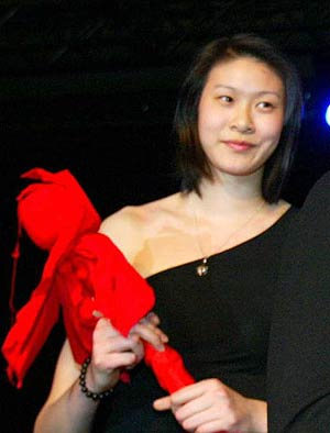 一袭黑色长裙,露出半边肩膀,是好莱坞刚流行过的式样。赵蕊蕊显然是无法习惯这样性感的装束,羞答答地上了台。直到迎上帅哥索普赞许的眼神,更是露出一脸羞涩的笑容。“还真不习惯这样穿,别扭极了。”说话声音一如平时的爽朗,“还是运动衣更符合我的气质。”这样的曳地长裙,还会再穿么?“也许不会了吧。”