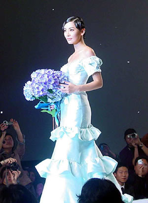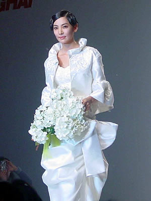 中新网3月24日电 据新闻晚报报道,昨天(23日)下午,在世贸商城的韩国时装纺织博览会上,韩国明星金素妍、郑俊镐身穿韩国顶级时装大师AndreKim(安德烈·金)设计的最新服装举行了一场别开生面的婚纱秀,赢得了中国影迷的热烈欢呼。下午三点,婚纱秀现场正式开放,争相涌进的观众让表演现场一时陷入瘫痪。主办方不得不现场赶人,没有邀请函的观众一律“清理”。当金素妍和郑俊镐双双出现在舞台上时,欢呼声伴随着闪光灯爆发出来,出现了仿佛是摇滚乐演唱会的情景。特别是当郑俊镐轻吻金素妍前额时,一些女影迷当场流出了热泪。