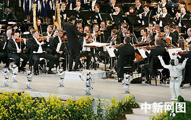 3月24日,2005日本爱知世界博览会的开幕上,索尼和本田公司的机器人与现场乐队同台表演。