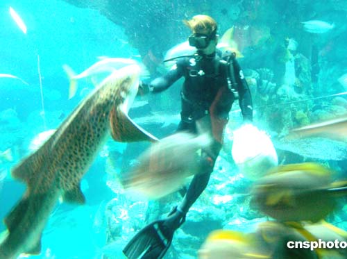 香港海洋公园海洋馆的潜水喂养员现场表演。作者:赵振清