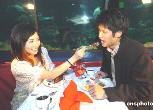 香港海洋公园复活节期间在海洋馆推出“海底晚宴”﹐在品尝美食的同时可欣赏到各种迷人的海洋生物在餐桌旁边往来游动﹐别有一番风趣。作者:赵振清