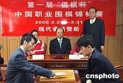 首届“倡棋杯”职业围棋锦标赛决赛三月二十七日在上海应氏围棋基金会进行,由孔杰七段(右)对阵王磊八段(左),应昌期围棋教育基金会董事长应明皓亲自担任裁判长。作者:汤彦俊