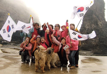 此前,他们在航行两小时左右后看见“独岛”都走出舱外,手里挥动着太极旗,或以“独岛”为背景照像或高唱歌曲《独岛是我们的领土》。