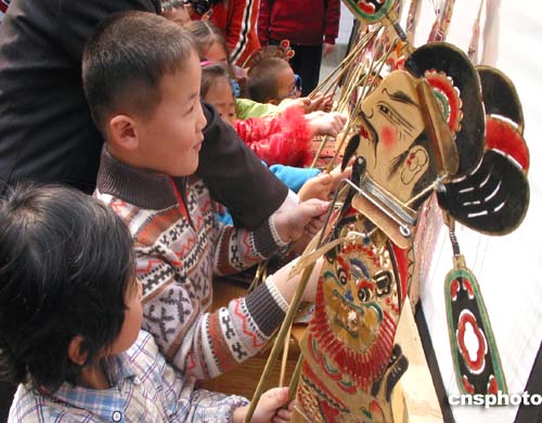 三月二十九日,郑州一小学几名孩子在老师指导下,学习摆弄传统皮影。皮影戏产生于西汉民间,如今日渐失传。河南郑州民间皮影戏剧艺术家为抢救这种稀有的民间文化艺术,联合了几家中小学校,让皮影戏走进校园。作者:慎重