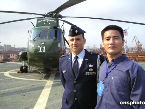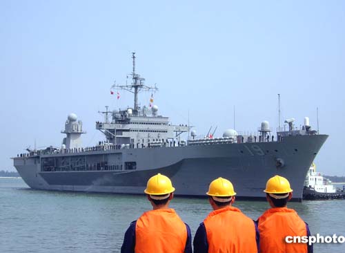 三月二十八日下午,美国海军第七舰队旗舰“蓝岭”号指挥舰在史蒂芬·梅拉德海军上校的率领下抵达湛江军港,开始对中国海军南海舰队为期三天的友好访问。图为美国海军第七舰队旗舰“蓝岭”号指挥舰抵达湛江港。作者:马灿
