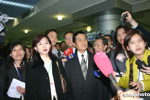 国民党新闻发言人张荣恭在机场接受记者采访