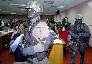 中新网3月30日电 为了说明反恐现况,台“立法院国防委员会”特地找了全副武装的军警特种部队人员到现场解说。带枪进“立法院”实在敏感,让不少“立委”瞠目结舌。