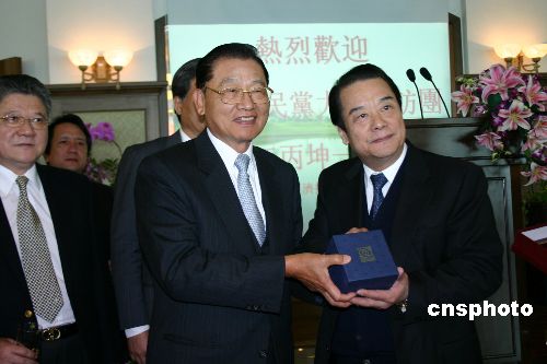 中国国民党副主席江丙坤一行三十日中午在南京会见江苏台商。他表示,台商在江苏得到最好的照顾,他们的事业大部分都相当的成功。台商在这里的发展对大陆的经济发展也有相当大的贡献。但是,两岸人民不但祈求经济的繁荣,更希望两岸的和平,因为两岸的和平才能带来两岸的繁荣。图为江丙坤向江苏台商赠送礼品。作者:陈旻
