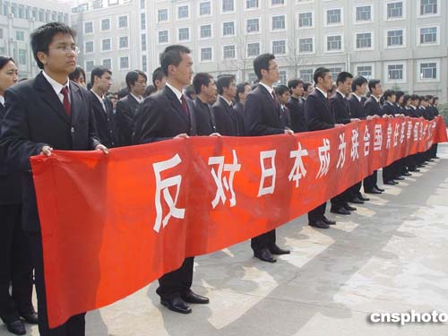 三十一日上午,河南检察职业学院的数千名学生在该校的广场上举行了以“维护世界和平,反对日本加入联合国常任理事国”为主题的大型签名活动,以此表示对日本要求加入联合国常任理事国的不满。图为活动中,学生们自发打起“反对日本成为联合国常任理事国”的横幅。作者:史宝银