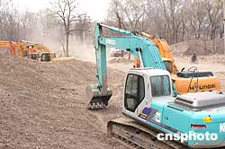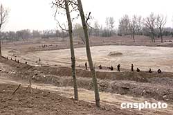 中国国家环保总局日前声明,圆明园湖底铺设防渗膜工程至今未进行建设项目环境影响评价,应该立即停止建设,充分征询社会各界的意见,依法补办环境影响评价审批手续。三月三十一日,投资1亿元,持续数个月的2000余亩圆明园湖底(铺塑料)防渗水工程开始停工。图为圆明园福海西侧一角藏龙卧虎,大型机械余热方尽。但是,圆明园三园(包括长春园、绮春园),约2000余亩湖底防渗工程已基本铺设完成了防渗水塑料,令专家和百姓失望。作者:邹宪