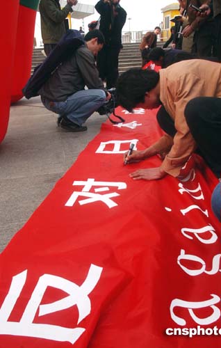 三月三十一日,中国民间保钓联合会、爱国者同盟网、反日货联盟网及中国民间爱国人士在北京朝阳公园发起的“反对日本成为联合国常任理事国”万米民意卷签名活动吸引了众多市民参加,签名条幅将由有关人士送交联合国总部。作者:韩艺冰
