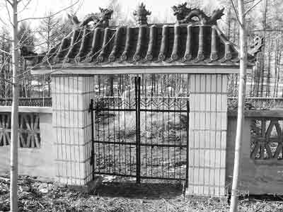 在青冈县芦河镇拥军村东北角约1公里处的一个小山坡上,一个用砖石砌成围墙的大院格外引人注目。大门是铁艺做成的,悬梁是绿色的琉璃瓦,上面雕刻着“双龙戏珠”。据拥军村的村民介绍,这里就是该村原村支书王国君家修建的祖坟。