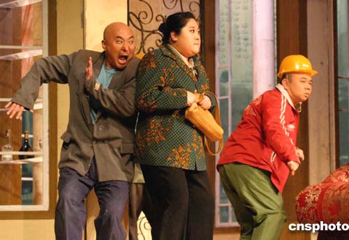 三月三十一日晚,中国内地著名喜剧明星陈佩斯“舞台喜剧三部曲”的最后一部《阳台》在北京上演。陈佩斯(左)在《阳台》里扮演的是包工头老穆。舞台上的民工形象格外生动逼真。头戴安全帽、身穿迷彩服、拿着喇叭大喊的民工形象堪称一绝。作者:张勤