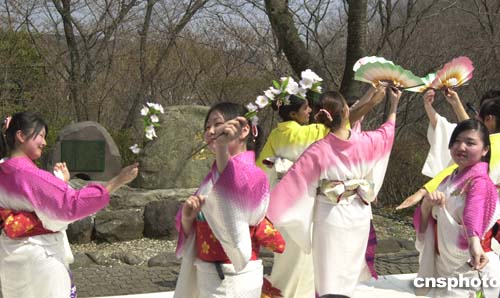 日本创价大学校园内三日举行传统的“周樱”观赏会。三十年前,在创价学会会长池田大作的提议下,首批留学创价大学的六名中国留学生种植樱花树苗,被命名为“周樱”。此后,每年春暖花开时节的“周樱”观赏会,便成为此间日本友人缅怀周恩来的一项传统活动。图为在“周樱”纪念碑前,创价大学学生手持樱花翩翩起舞。作者:王健