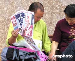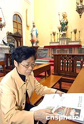 澳门一位女士在主教堂内追思教皇,三日,当澳门信徒得悉教皇保罗二世离世后,他们纷纷到教堂用各种形式悼念教皇。作者:梁永强