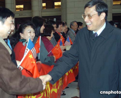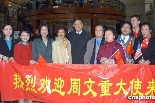 中国新任驻美大使周文重当地时间四月三日中午抵达美国首都华盛顿履新,受到当地华人侨学界代表的热烈欢迎。