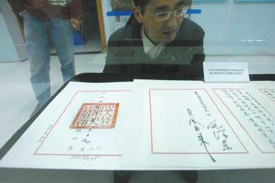 在100平方米左右的展厅里,存放在玻璃展柜中的一份颜色微红、长约一米的文件特别显眼,文件的右侧有两个红色的繁体大字“国书”。这是1950年由我国首任驻瑞典大使耿飙呈递给瑞典国王的国书复制件,完全按照当年新中国第一批国书的标准复制,大小及式样与原件一模一样。它是特别从瑞典外交部那里复制得来的,因为国书是交给外国的,本国自己不保存。