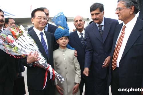 中国国务院总理温家宝傍晚抵达伊斯兰堡空军机场,开始对巴基斯坦进行为期三天的正式访问。图为温家宝与给他献花的巴基斯坦少年亲切合影。