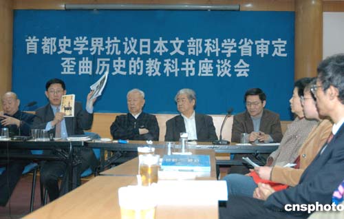 四月六日,“首都史学界抗议日本文部科学省审定歪曲历史的教科书座谈会”在北京举行。来自首都史学界的专家学者就日本文部科学省四月五日审定通过了歪曲历史的二零零六版《新历史教科书》事件进行座谈,并一致认为日本政府应当高度重视亚洲近邻的正义呼声,本着对历史认真负责的态度,诚实履行反省侵略历史的承诺,切实妥善处理这一问题。作者:徐曦弋