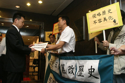 香港索偿协会、新论坛等社会团体代表8日到日本驻港总领事馆递交请愿信,强烈抗议日本政府审订通过美化战争暴行的所谓新版历史教科书,要求日本政府停止所有歪曲历史、军事扩张的不当行径。