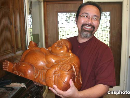 台湾花莲市古玩具店“畲歆阁”老板方永清,近日向中新社记者展示他收藏的三义木雕精品弥勒卧佛。苗栗县三义乡是木雕重镇,三分之一人口从事木雕业,产品独步台湾全岛。作者:董会峰