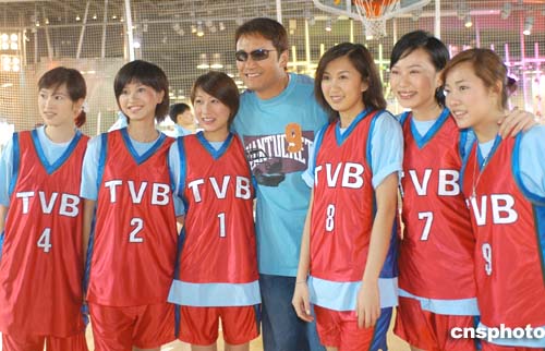 香港电视剧《学警雄心》为加强宣传,15日与警察篮球代表队举行友谊赛,众多女艺员加盟此次活动。图为香港艺员苗侨伟(男)为女艺员们打气助威。