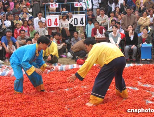 四月十六日,在广西百色市第二届布洛陀民俗文化旅游节上,该市田阳县的壮族男子在西红柿堆上进行摔交比赛。