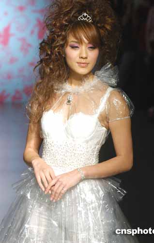 歌星官恩娜4月16日在香港为著名时装设计师尹泰尉时装演译作品。作者:邓庆乐