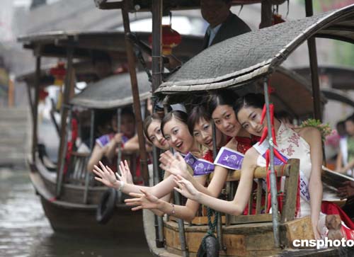 二零零五年国际旅游小姐中国区总决赛的选手,四月十七日游览千年古镇西塘,为春日的古镇增添艳丽色彩。作者:毛建军