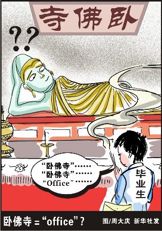 “卧佛寺,就是英语office(办公室)的谐音嘛,想挤进公司做白领当然得去卧佛寺了。”近日,在北京植物园,除了踏青赏花的市民外,还多了一些大学生去卧佛寺烧香。