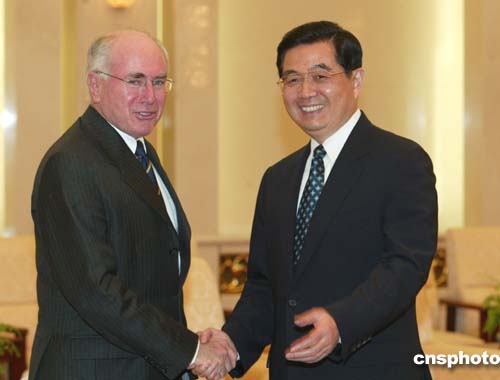 中国国家主席胡锦涛四月十八日在北京会见澳大利亚总理霍华德。作者:满会乔