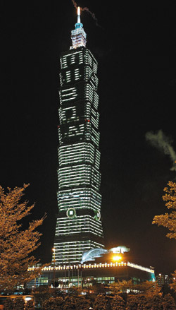 据台湾联合报报道,台北101大楼18日晚先行试灯,清晰可见大楼北面有着相对论公式E=mc2,大楼西面有着TAIPE。