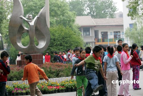 陕西西安后宰门小学的学生们在上课前做游戏。这所小学的前身是中国国民党主席连战先生小学时的母校。四月三十日,来大陆访问的中国国民党主连战将来此造访。作者:武仲林