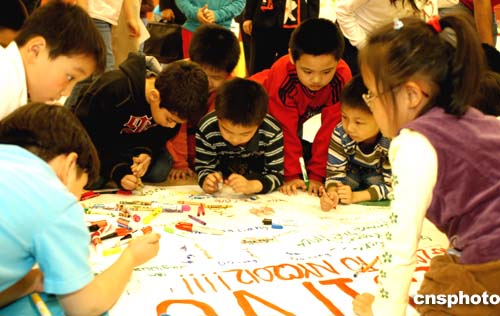 四月二十一日,纽约市申办奥运会执行委员会和基督教青年会(YMCA)联合主办“庆祝二00八年北京奥运成功和纽约申办二0一二年奥运成功”活动,纽约小学生用彩笔签名表达祝愿。作者:龚文谟