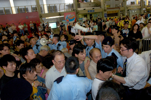 与四名亲友一起入场的王先生,于十时四十分到达换领处排队,当时他们排第八。他指出,换领处只有一张台及四名职员,“铁马”也只有几个,后来才加多几个,人手非常不足,未几突然有人冲前抢帽,之后又有人抛帽,场面即时失控,十多个“铁马”被推跌;后来听到马会方面广播称已派完,群众嘘声四起。混乱中他也被推跌,幸未有受伤,但手戴的八达通表被撞烂。事后他向职员投诉,要求赔偿。