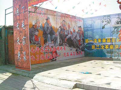 北京海淀区一家酒楼把毛主席与农民座谈时的场景设计为广告牌,悬挂在店外,并写着“吃了湘菜成伟人”的广告语。