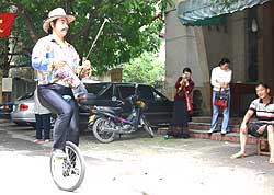 今年四十九岁的吕布是广西南宁市一位民间艺术家,他可在独轮车上自如演奏中国和西方的乐器达一个小时之久。吕布爱好二胡,二00一年他开始迷上杂技独轮车,苦练三年多后,他如今已能边骑独轮车边演奏萨克斯、二胡、笛子、葫芦丝等四种乐器。作者:蒋雪林