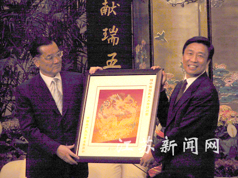 李源潮向连战赠送了礼品,是一副南京特产云锦织出的金丝团龙。李源潮说:龙是中华民族的象征。连战向江苏省回赠了礼品,是台湾的三羊开泰瓷瓶,连战说:以此祝愿江苏发展、兴旺。