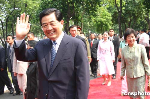 胡锦涛说,中方愿同菲方一道,积极建立中菲致力于和平与发展的战略性合作关系,共同开创中菲关系更加美好的未来。