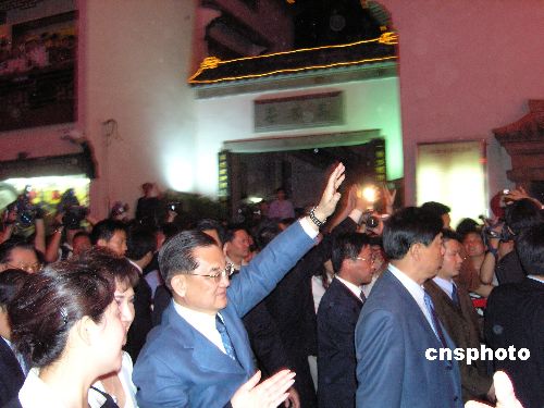4月27日,中国国民党主席连战夫妇在夫子庙状元楼酒店品尝泰淮小吃晚宴后,携夫人连方瑀女士轻松夜游秦淮河。晚8时许,连战主席餐后步行走出状元楼酒店,在夫子庙流连的灯光中,沿街两旁的市民击掌庆贺,连战微笑着向行人致意。整个游览过程大约在半小时左右。作者:水从泽