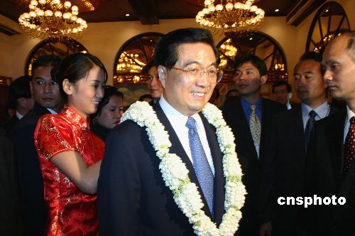 四月二十八日,中国国家主席胡锦涛在马尼拉出席菲律宾华人各界欢迎会,接受华人敬献的茉莉花环。作者:李静